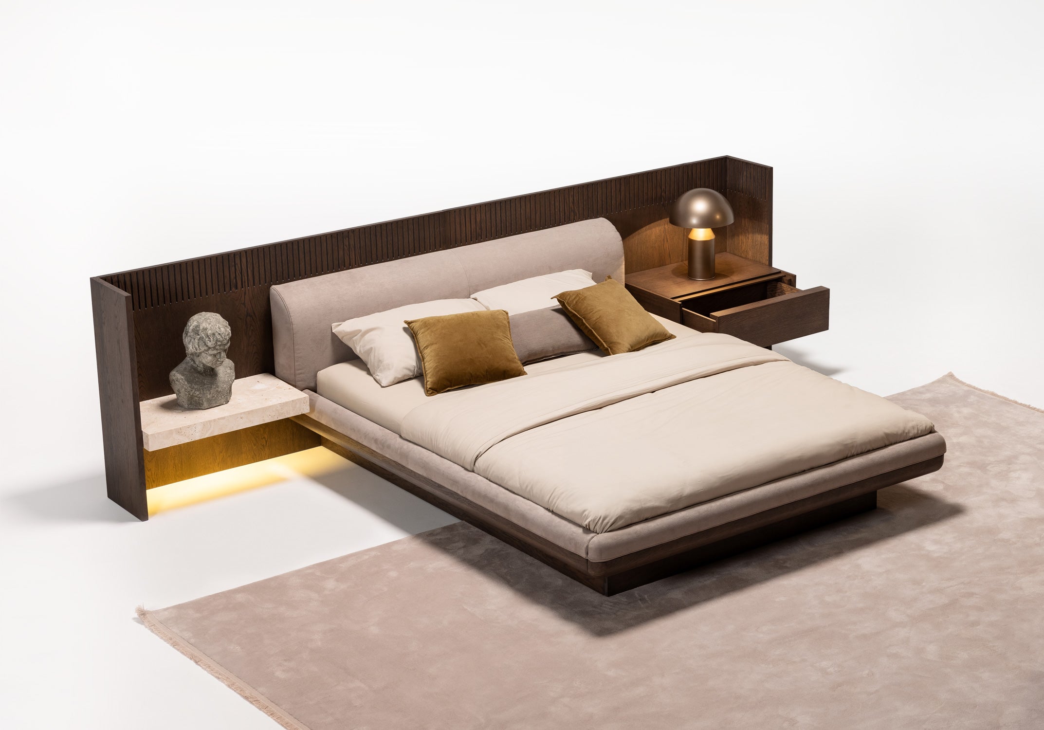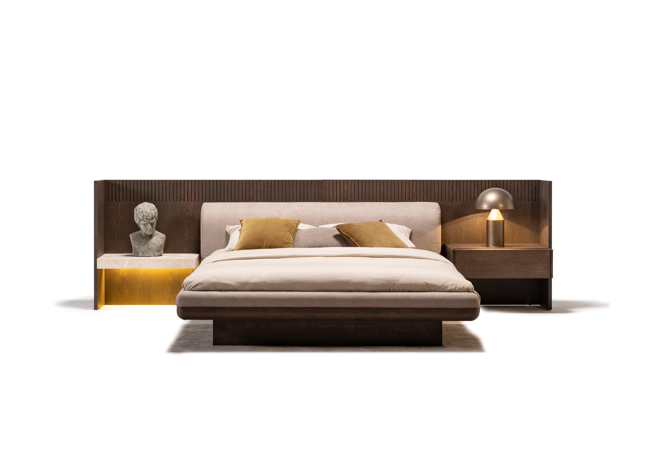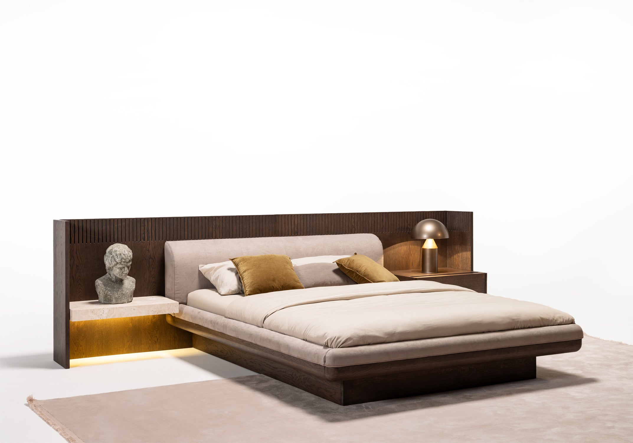 Intra meşe kaplama ve özel üretim doğal mermerin birlikte kullanıldığı Edessa Karyola, yatak odalarında sade ve dengeli bir zemin oluşturur. Oranlı ölçüleri sayesinde farklı yatak odası yerleşimlerine uyum sağlar. Net hatlara sahip tasarımı, Edessa serisinin diğer parçalarıyla birlikte bütünlüklü bir kullanım sunar.