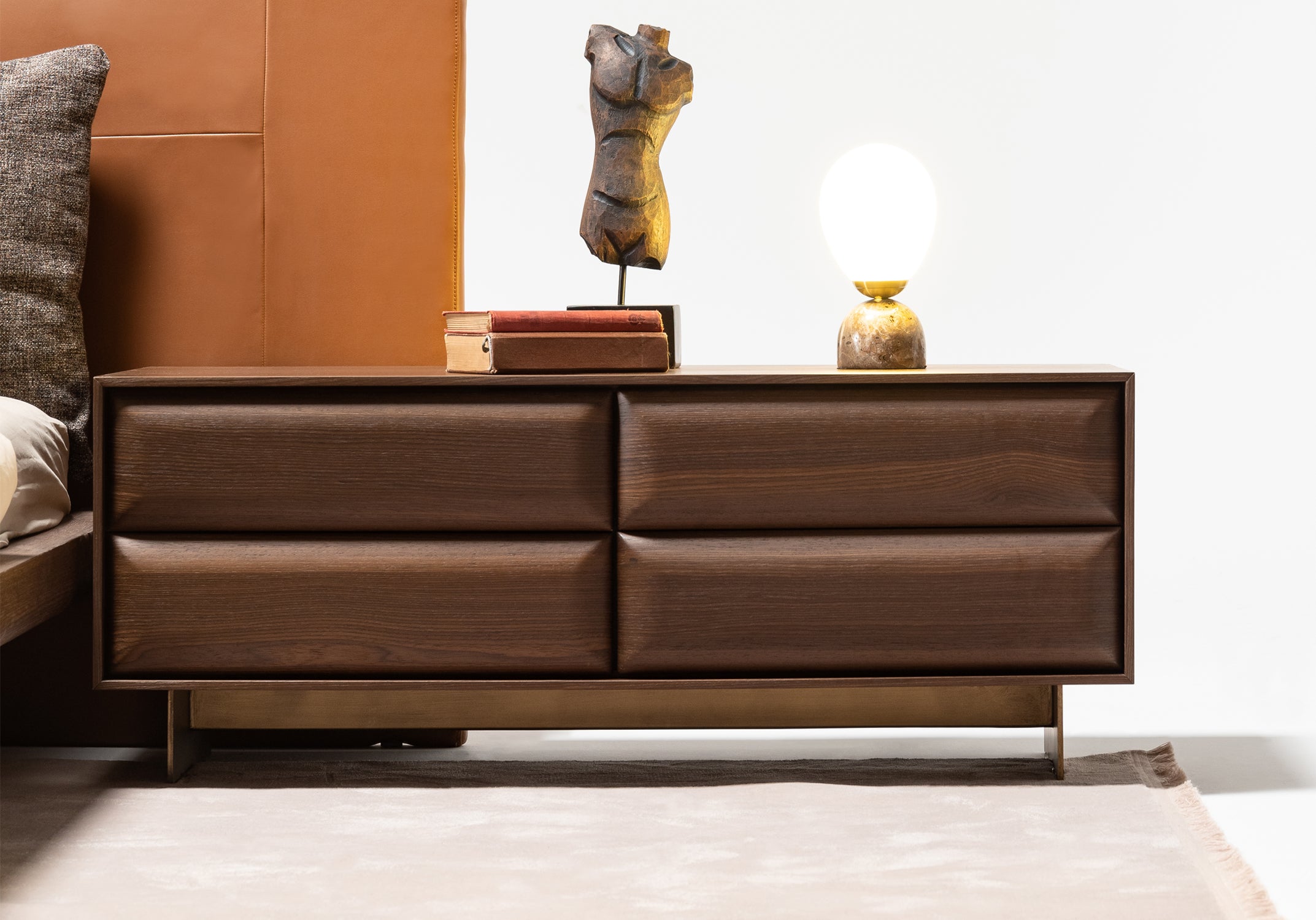 Thermo meşe kaplama gövdesi ve özel fırın boya eskitme gold metal ayak detayıyla tasarlanan Era Komodin, yatak başlarında fonksiyonel bir kullanım alanı sunar. Geniş yüzeyi sayesinde günlük eşyalar için rahat bir yerleşim imkânı sağlar. Net ve sade formu, yatak odasında düzenli bir görünüm oluşturur.