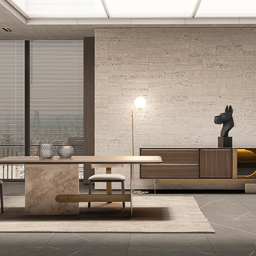 Thermo meşe kaplama ve özel üretim doğal mermerin bir arada kullanıldığı Era Yemek Masası, geniş yüzeyiyle yemek alanlarında rahat bir kullanım sunar. Dengeli oranları ve sade formu sayesinde mekânda düzenli ve uyumlu bir görünüm oluşturur. Era serisinin diğer parçalarıyla birlikte kullanıldığında bütüncül bir yemek alanı yerleşimi sağlar.