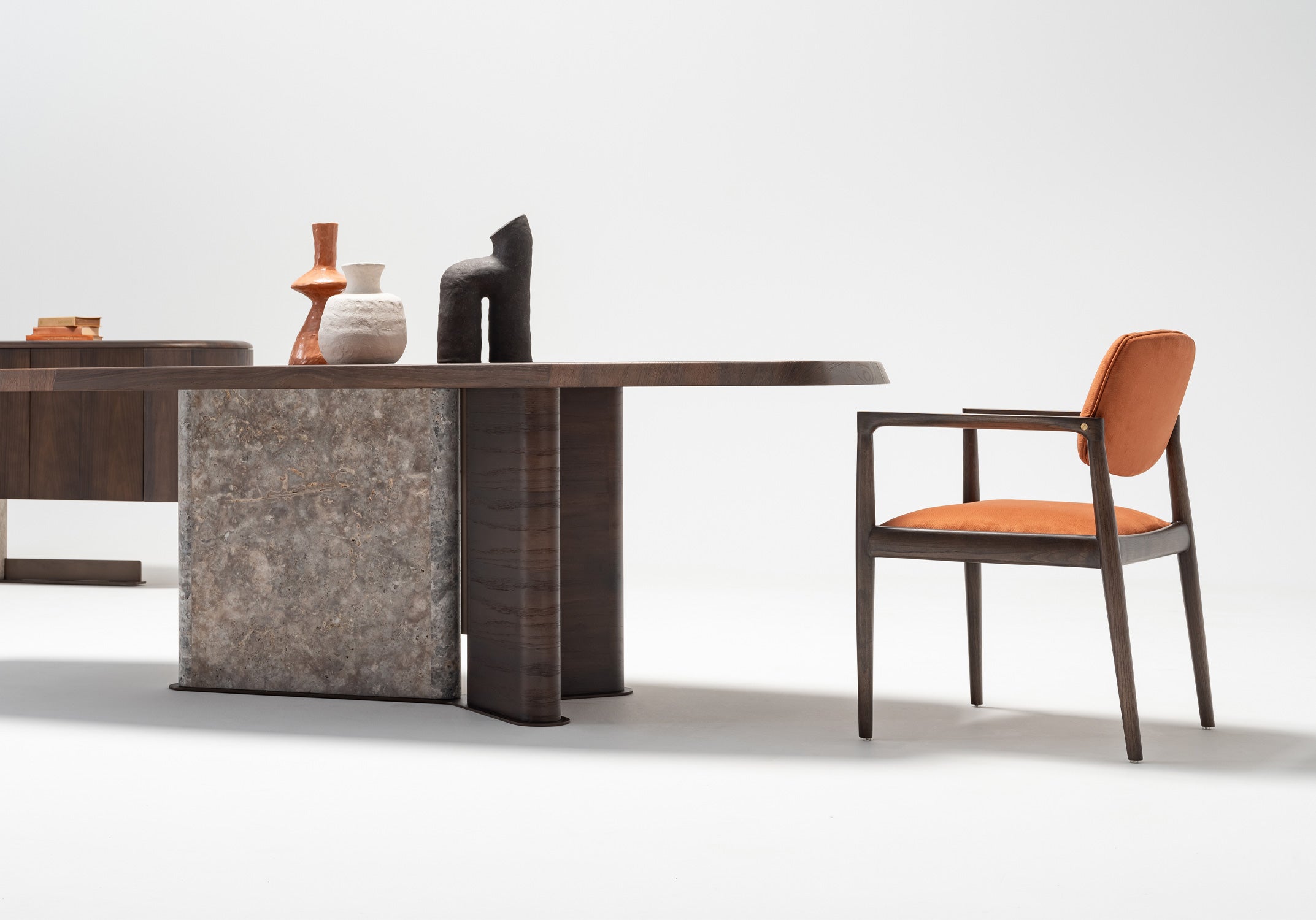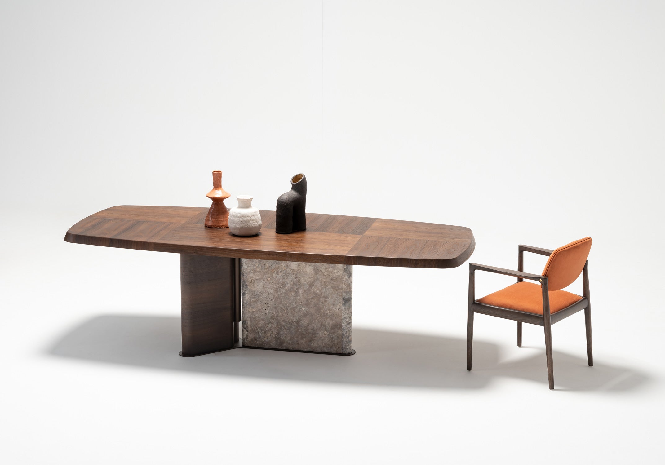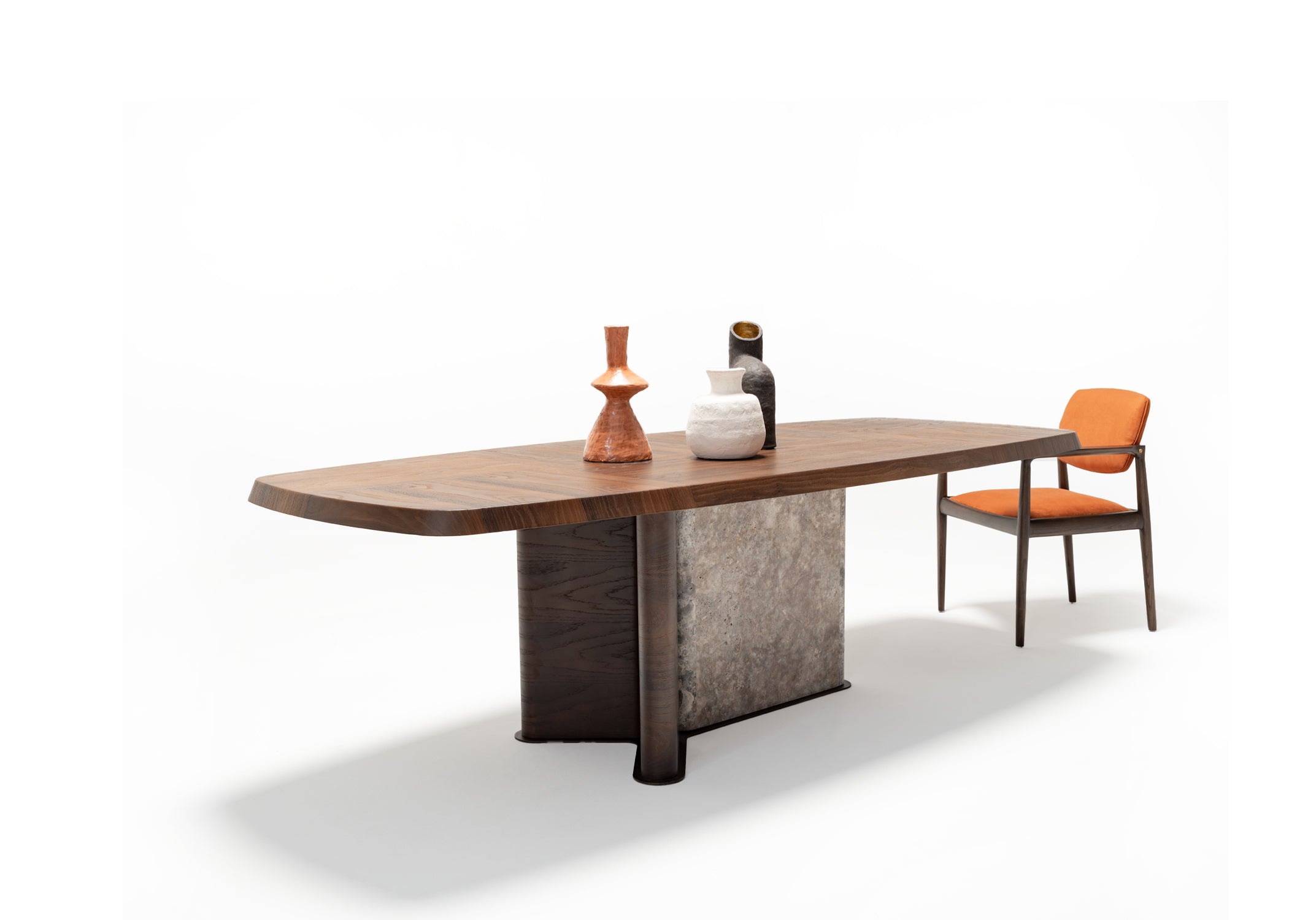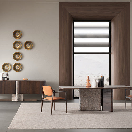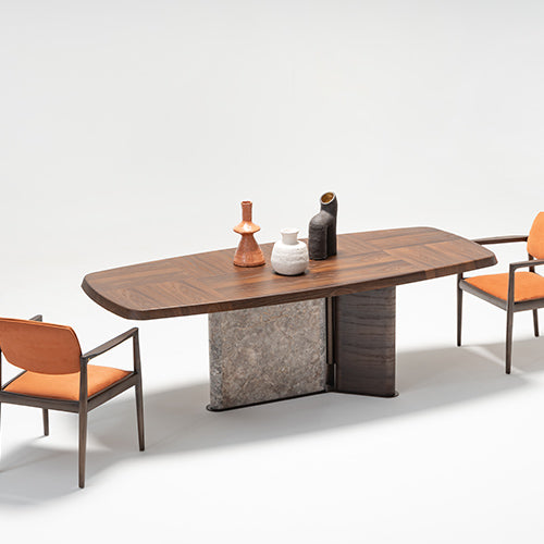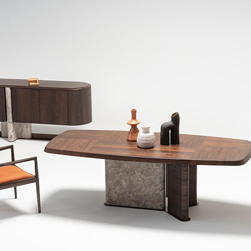 Tobacco meşe kaplama ve özel üretim doğal mermerin bir arada kullanıldığı Odeon Yemek Masası, geniş yüzeyi ve dengeli formuyla yemek alanlarında hem şık hem de fonksiyonel bir kullanım sunar. Net ve sade çizgileri sayesinde mekânda ferah ve düzenli bir görünüm oluşturur. Doğal malzeme dokusuyla modern ve zamansız bir atmosfer yaratır, günlük kullanımdan kalabalık davetlere kadar farklı ihtiyaçlara uyum sağlar.
