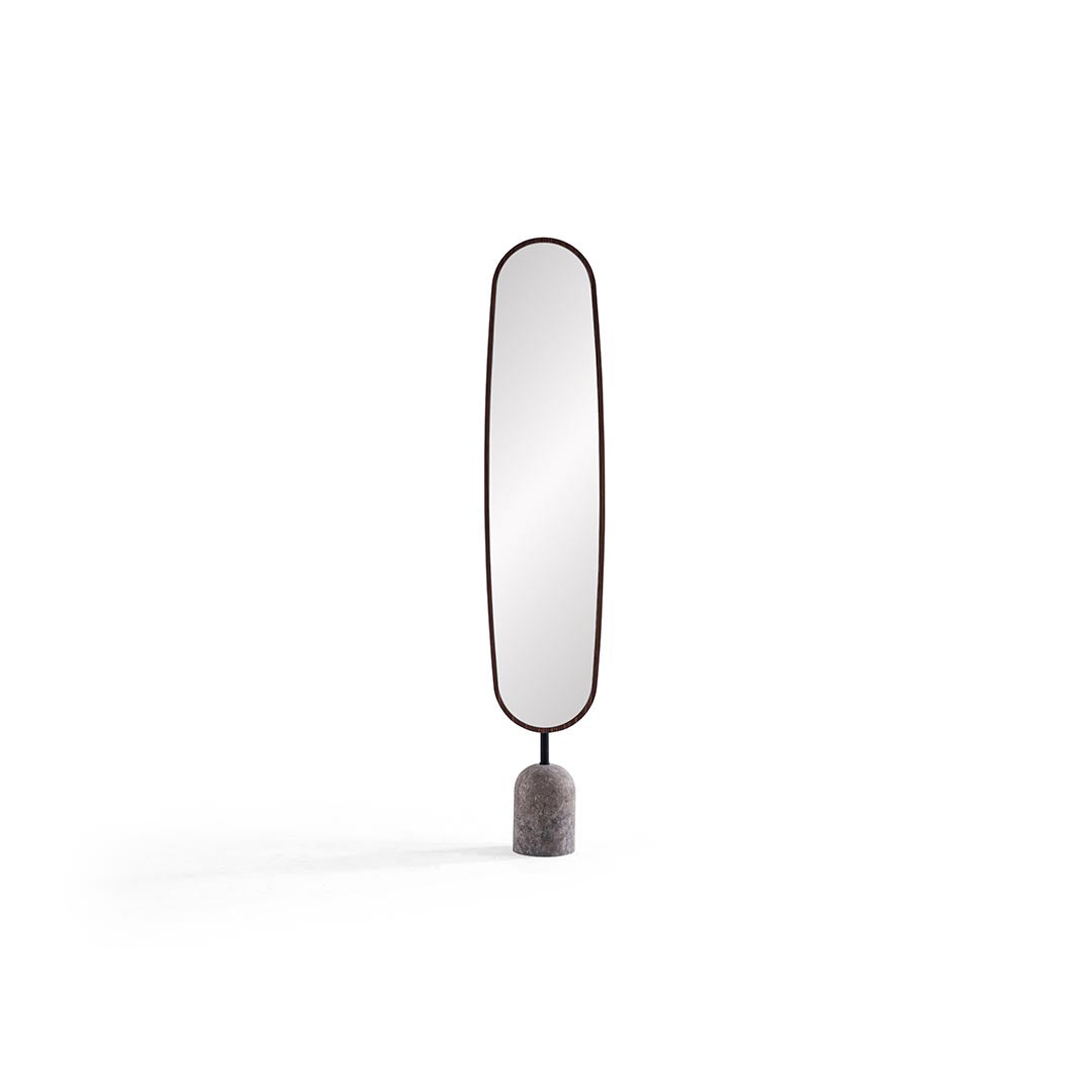 Bloom Boy Aynası, doğal ceviz kaplamanın sıcak dokusunu mermer ayağın zarif görünümüyle bir araya getirerek modern ve dengeli bir stil sunar. İnce ve yüksek formu sayesinde hem fonksiyonel hem de dekoratif bir parça olarak öne çıkar. Minimal çizgileri, bulunduğu her mekâna hafiflik ve şıklık katar.